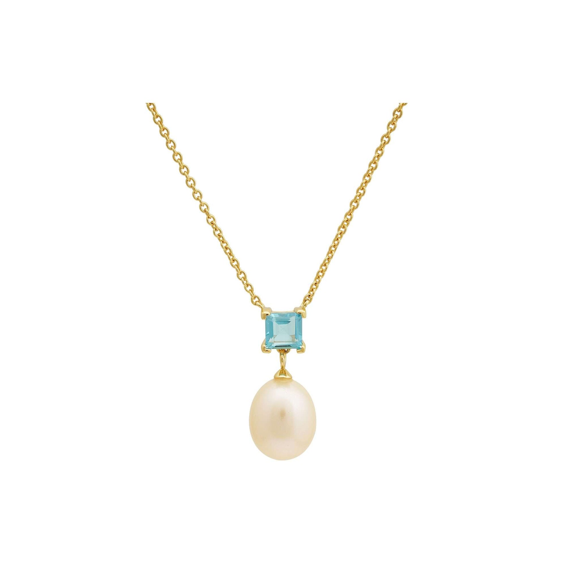 5 MM Blue Topaz Square Cut Stone & 9 - 9.5 MM Freshwater Pearl Venice Drop Pendant Necklace - Adjustable Chain in 24 CT Silver 925 Setting